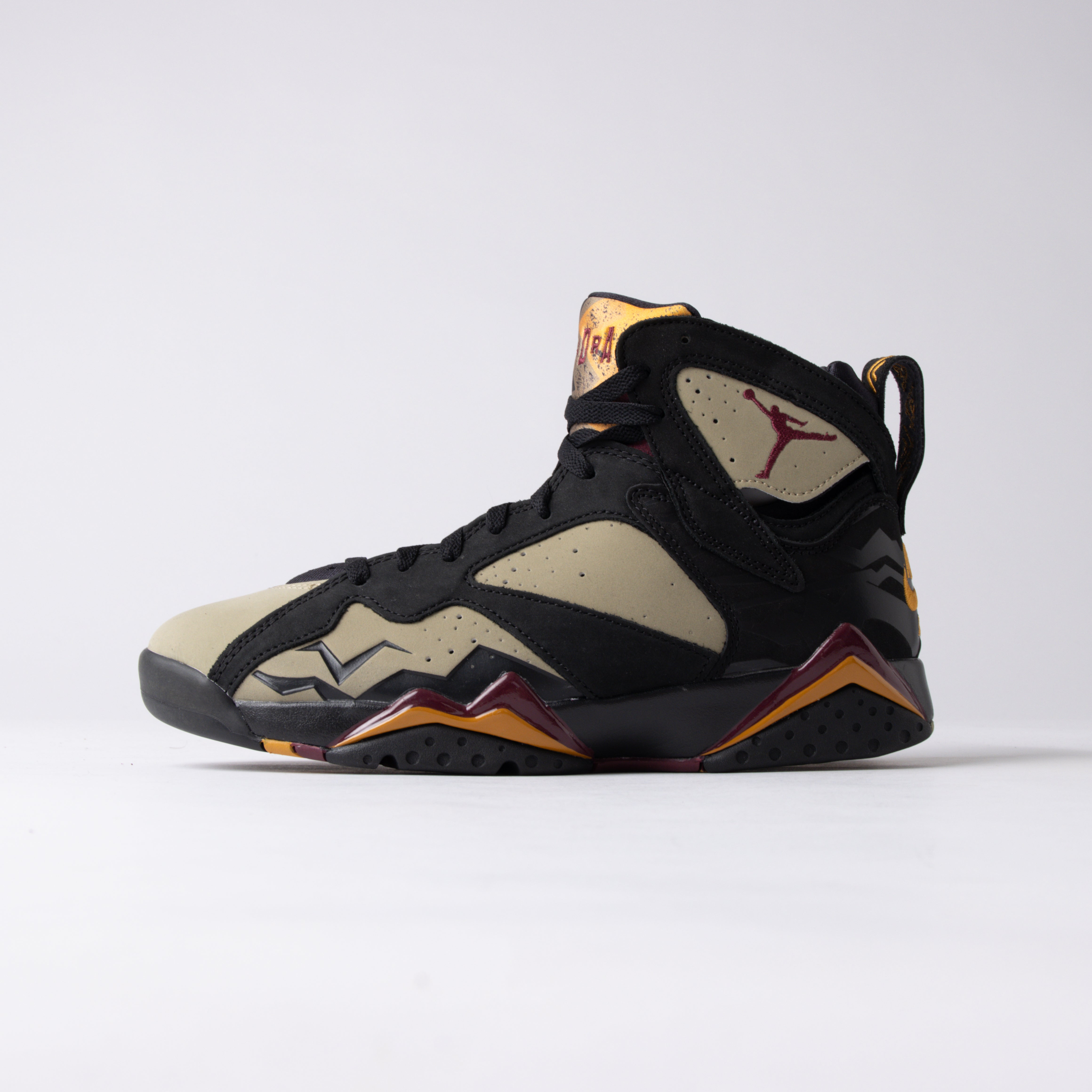 El AJ7 fue diseñado por Tinker Hatfield con influencias africanas en los patrones geométricos y sin la clásica unidad Air visible, priorizando ligereza y ajuste. El Black Olive recupera esa esencia, vistiendo la silueta con cuero negro y suede oliva que evocan un look premium y versátil, acompañado de acentos en burdeos y dorado que recuerdan al ADN original del modelo.