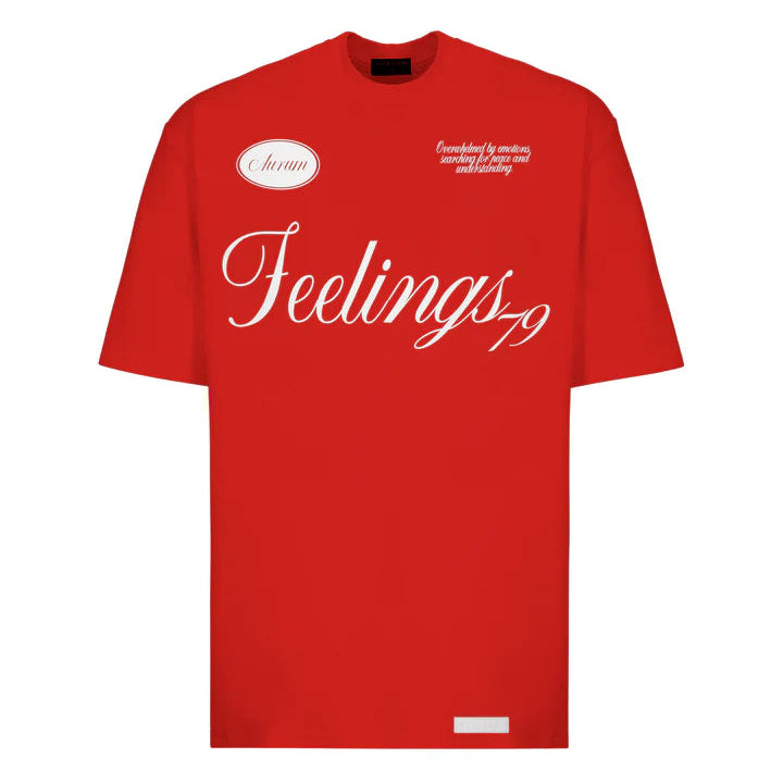 Al frente, el mensaje “Aurum Red Feelings” se presenta en alta densidad, transmitiendo emoción y fuerza visual. En la espalda, el logotipo Aurum se imprime también en alta densidad, como cierre gráfico sobrio y contundente. El diseño se completa con un rubber blanco que contrasta con la base cromática, y una marquilla tejida que aporta detalle y autenticidad.