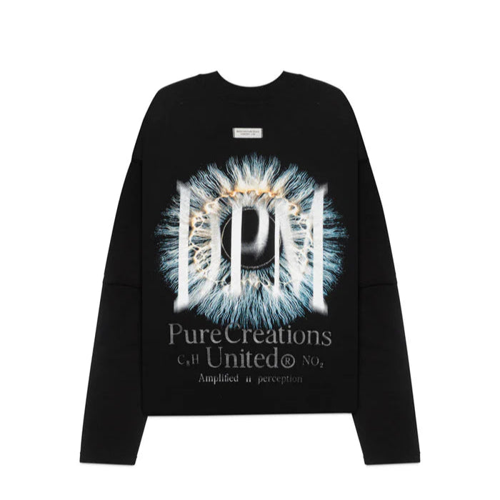 Camiseta color negro manga larga. Box Fit. Tela: 100% algodón. Frente con estampado en alta densidad y gráfico en espalda con textos en alta densidad y marquilla tejida.