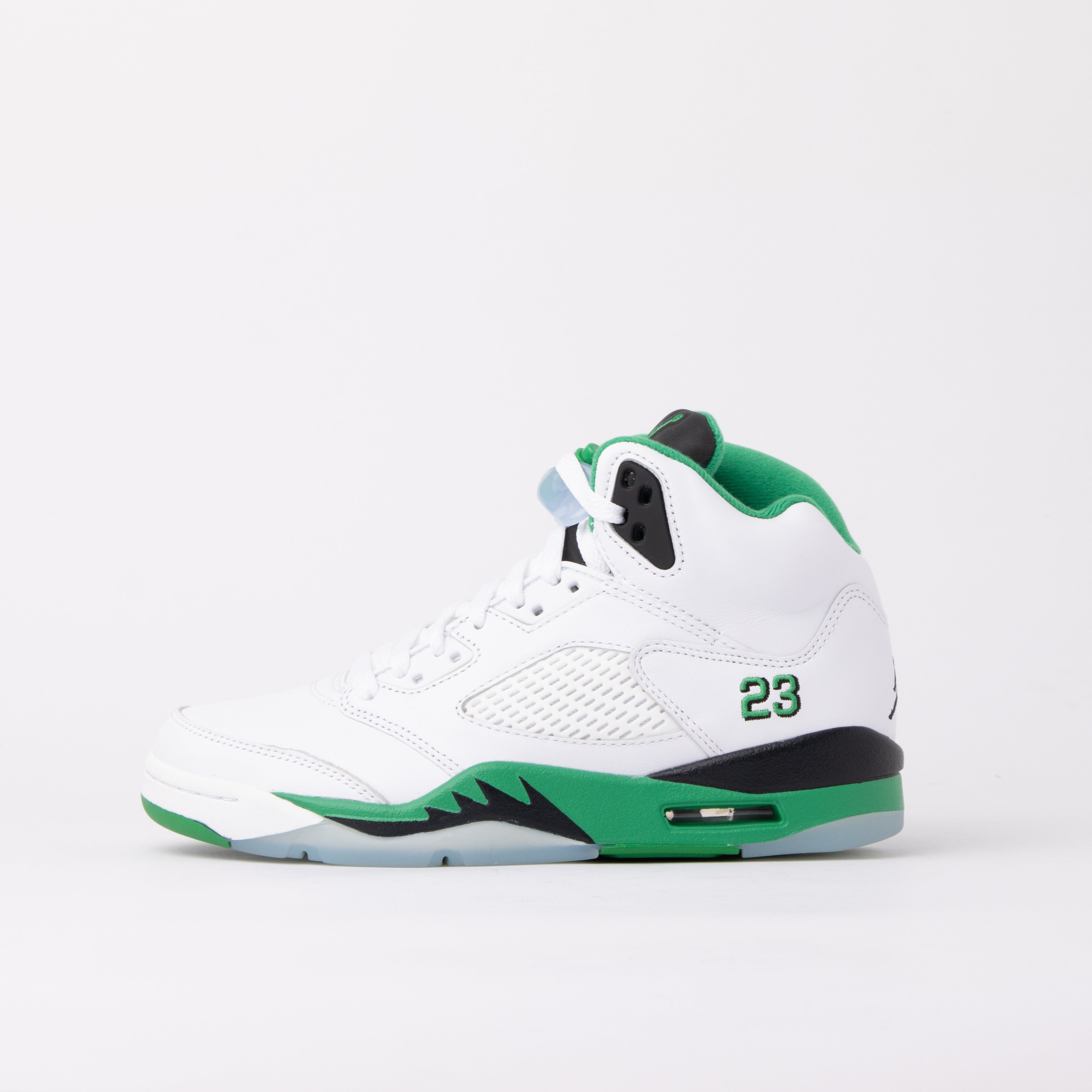 El AJ5 se inspiró en los aviones de combate de la Segunda Guerra Mundial, con detalles como la suela translúcida y los “dientes de tiburón” en la mediasuela. En el Lucky Green, Jordan Brand combina esa herencia con una paleta moderna: cuero blanco premium y acentos en verde intenso que evocan vitalidad y éxito. Un guiño contemporáneo a la tradición OG, adaptado al presente.